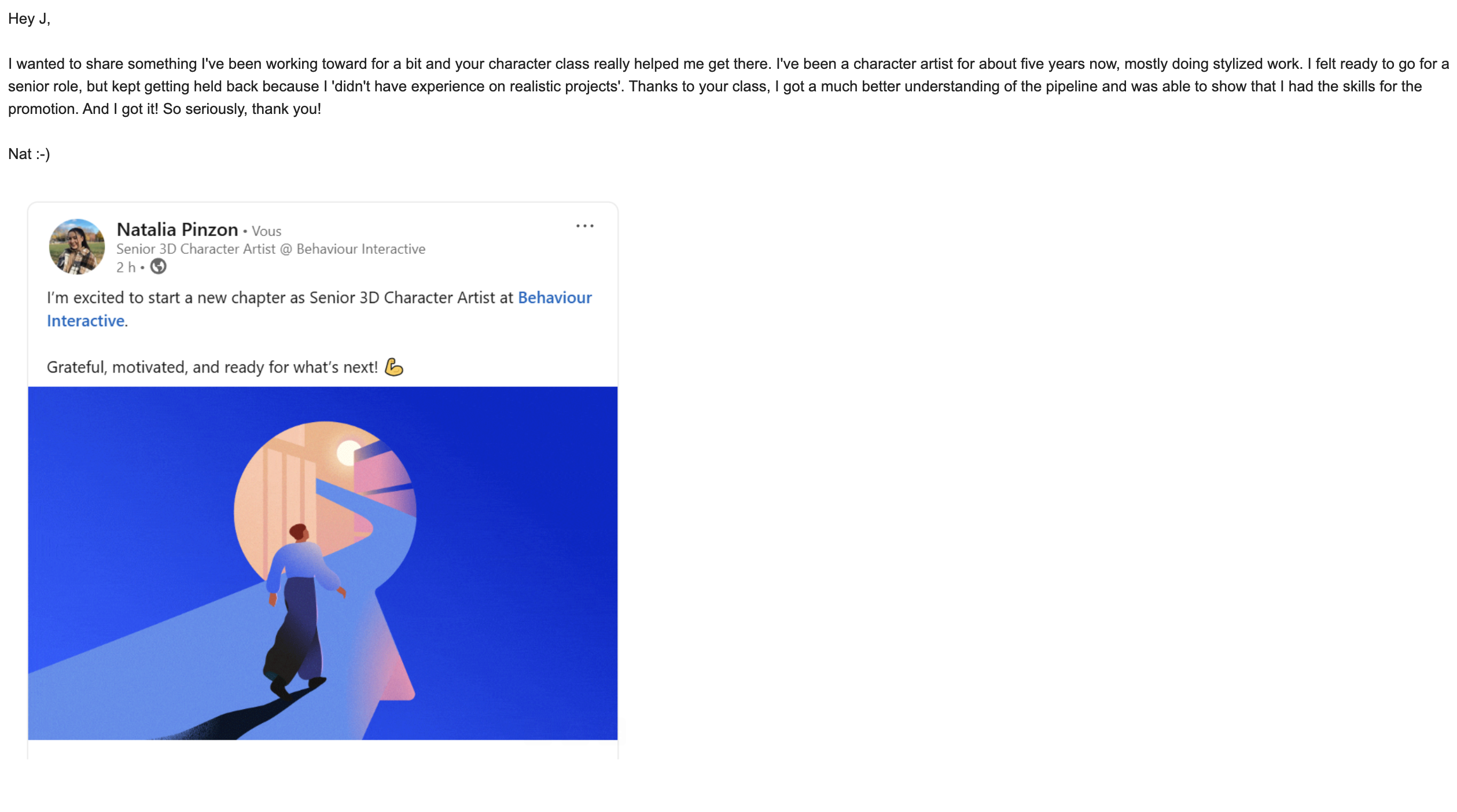 • Students landing their first studio jobs. Sometimes at dream studios
